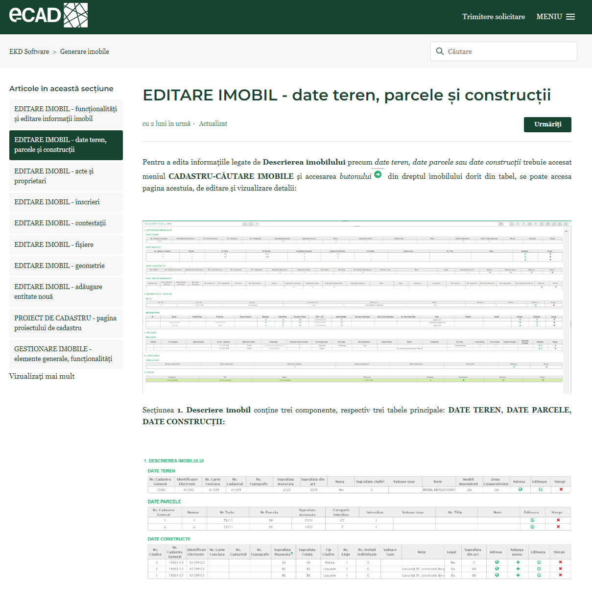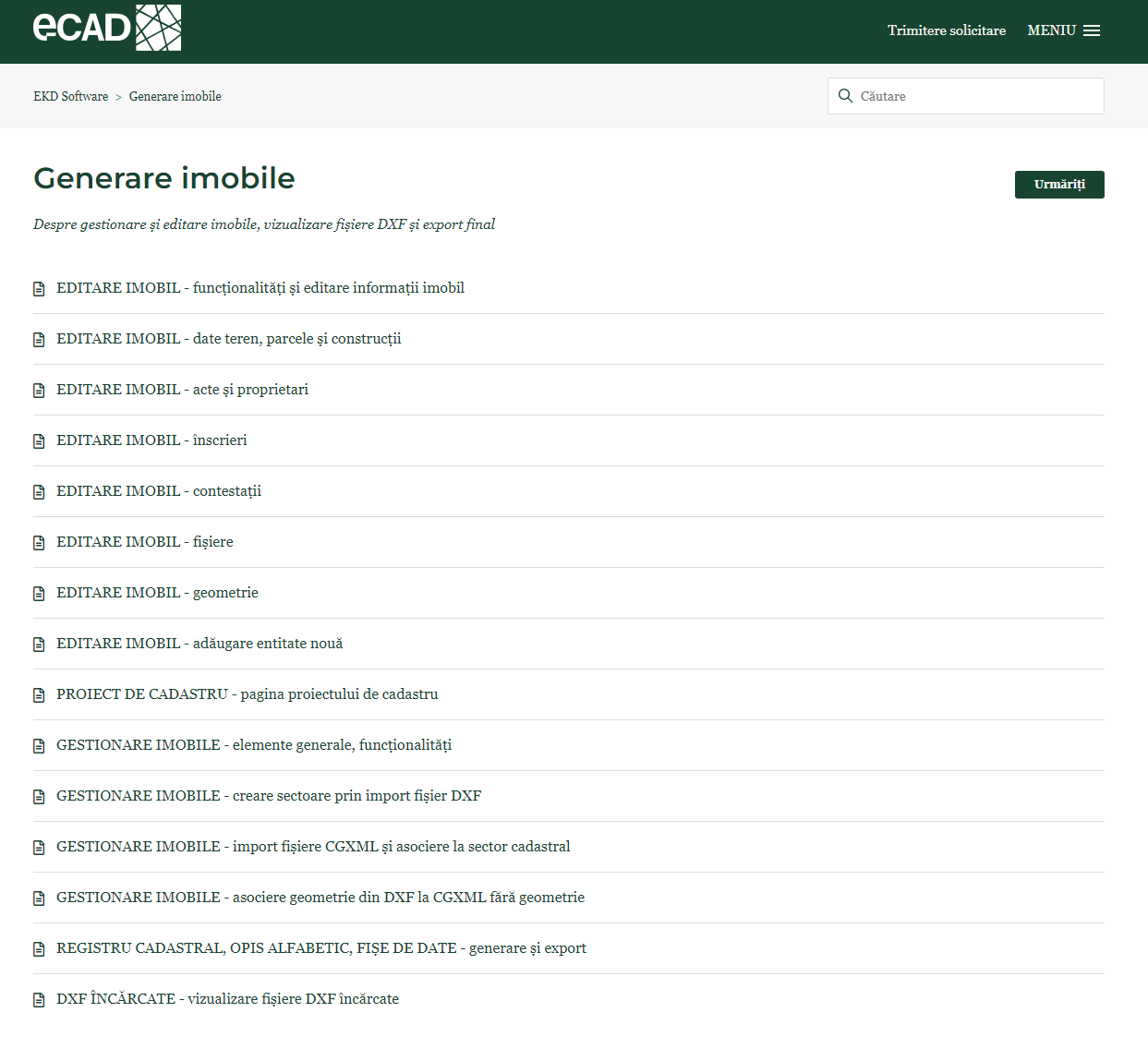 - Generare imobile - o categorie în care se regăsesc articole referitoare la gestionarea și editarea imobilelor, vizualizarea fișierelor DXF încărcate și procesele ce țin de exportul final al documentației pentru OCPI.