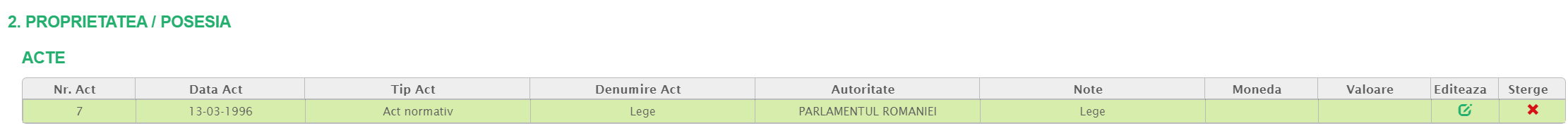 La secțiunea 2. Proprietatea/Posesia - ACTE, trebuie să fie adăugată o înregistrare aferentă Certificatului de Posesor, cea reprezentată de Legea 7: