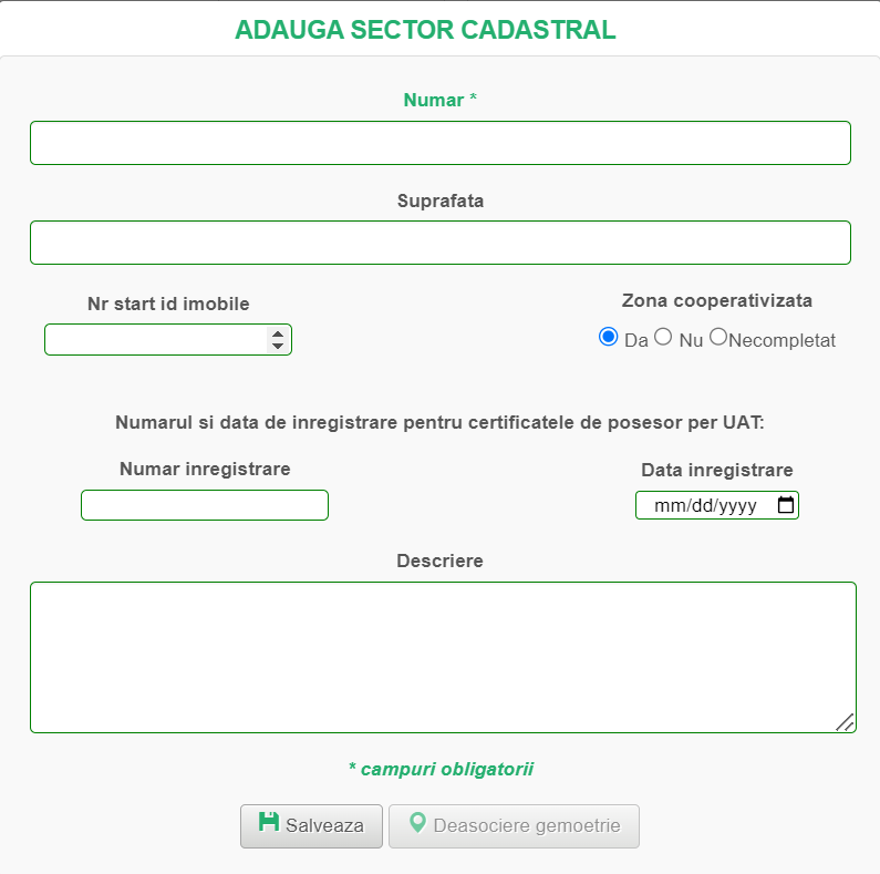 Câmpurile obligatorii (Număr), marcate cu „*”, trebuie obligatoriu să fie completate pentru a se putea realiza și salva procesul de editare al sectorului: