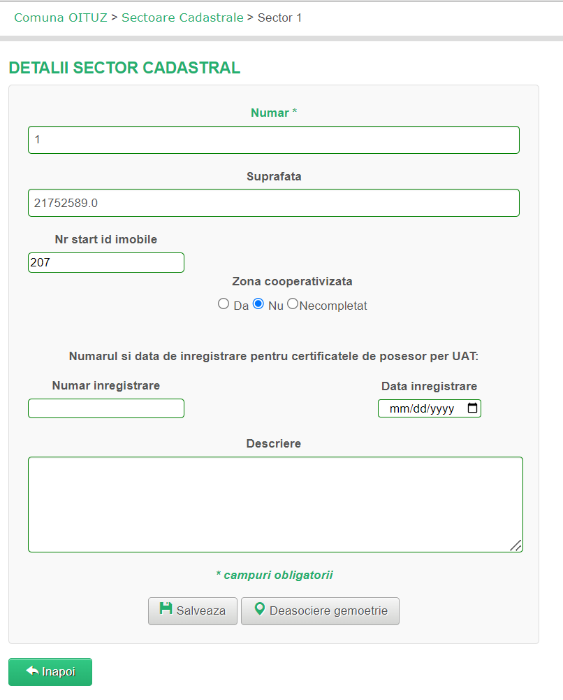 care deschide o nouă pagină numită DETALII SECTOR CADASTRAL, unde se pot edita câmpurile referitoare la numărul sectorului, descrierea, suprafața, nr. start id imobile, se poate bifa cu „Da”, „Nu” sau „Necompletat” dacă zona este cooperativizată, numărul și data de înregistrare pentru certificatele de posesor per UAT.
